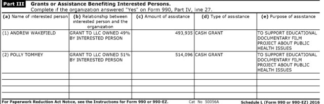 If memory serves, VAXXED concluded with a long list of sponsors. So they apparently had a fair amount of money to work with to produce the film. The film was a product of the Autism Media Channel, which is a limited liability corporation (LLC) owned by Polly Tommey and Andrew Wakefield, based on tax records. At the same time, Vaxxed was associated with a charity: AMC Foundation. Said foundation is run by Andrew Wakefield with Polly Tommey and Brian Burrowes also listed as directors (at least on past tax forms)…”